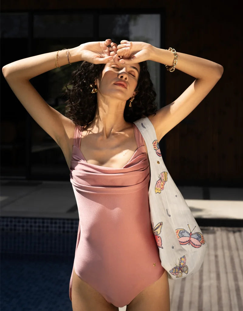Introducing our Peachy-kins Swimsuit, a captivating blend of allure and sophistication. Designed to accentuate your curves, the sleek cowl neck detail adds elegance while highlighting your neckline. Crafted for confidence, this swimsuit hugs your figure in all the right places, ensuring you radiate charm and magnetism poolside or beachside. Flaunt your curves with confidence in this irresistible piece, your ultimate companion for sun-soaked glamour.
